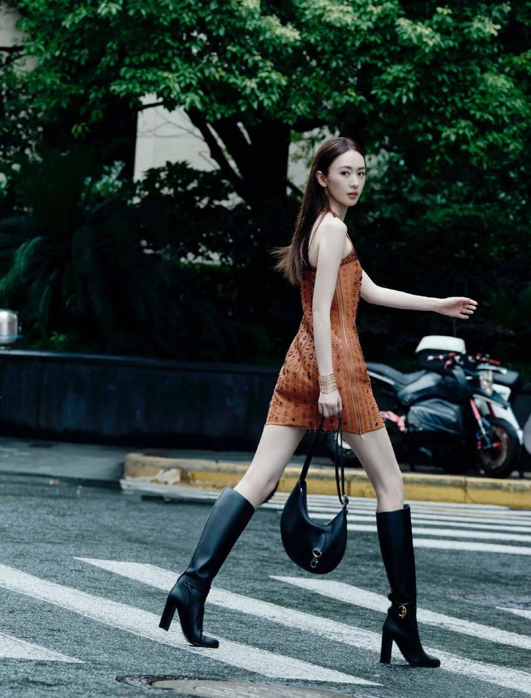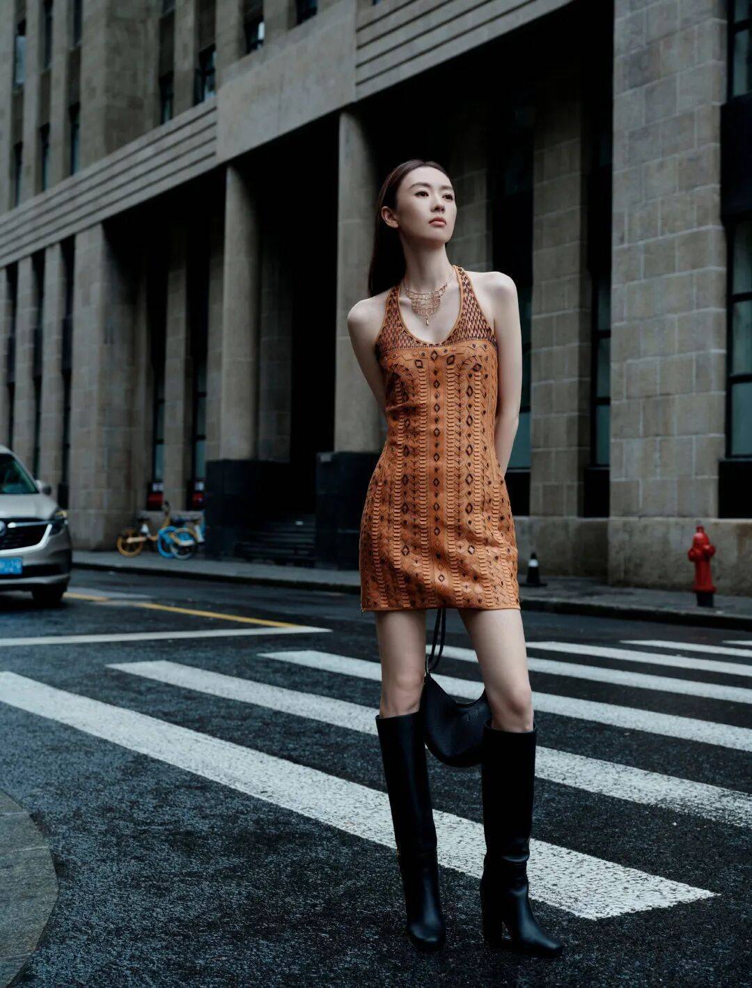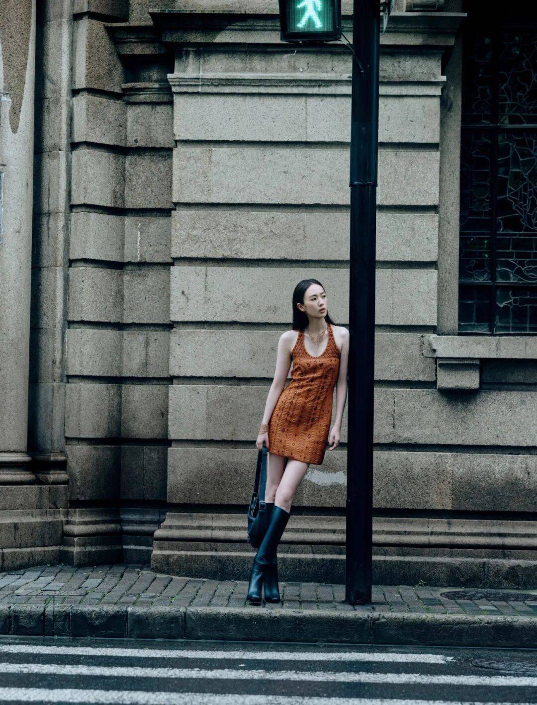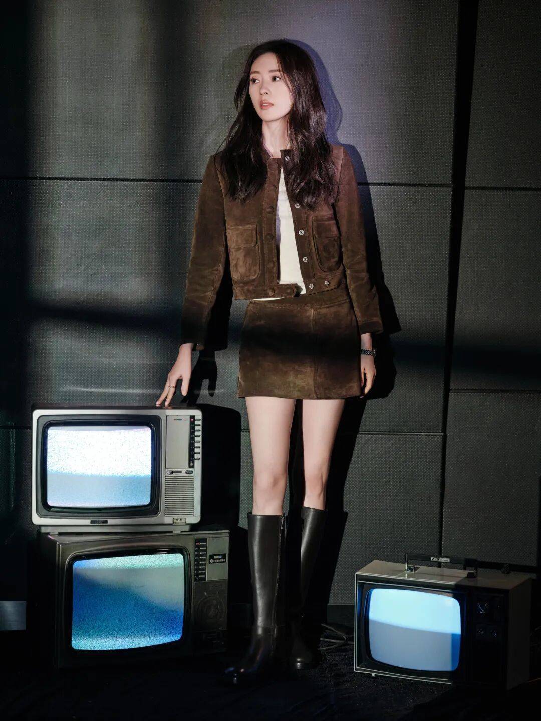 利落的麂皮绒套装尽显修长曲线,长靴整添造型的帅气摩登感,霓虹都市中身姿闪烁光影,交错间洒脱释放。
